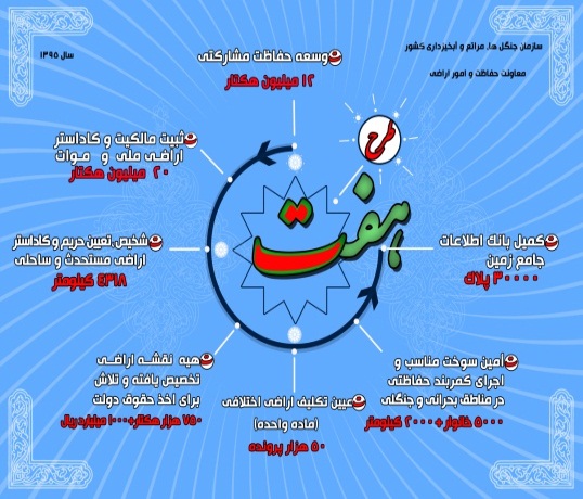 به گزارش معاونت حفاظت و امور اراضی در ابتدای سال 95، پس از نشست های متعدد تخصصی با مدیران کل و کارشناسان دفاتر زیر مجموعه، هفت محور اساسی شامل توسعه حفاظت مشارکتی، تعیین تکلیف اراضی اختلافی، تثبیت مالکیت و کاداستر اراضی ملی و موات، تثبیت مالکیت، تعیین حریم و کاداستر اراضی مستحدث و ساحلی، تهیه نقشه اراضی تخصیص یافته و تلاش برای اخذ حقوق دولتی، تأمین سوخت مناسب و اجرای کمربند حفاظتی در مناطق بحرانی و جنگلی، تکمیل بانک جامع زمین تعیین و به عنوان مهم ترین فعالیت های حوزه معاونت در قالب طرحی را به عنوان « طرح هفت» در سال 95 کلید خورد.