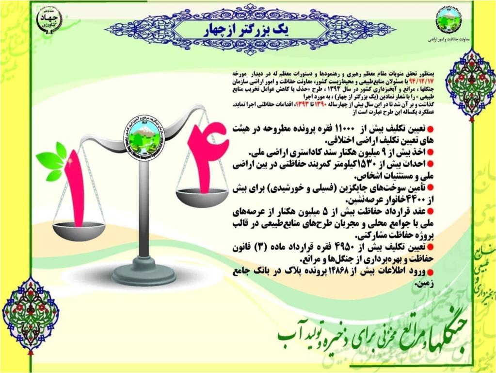 براساس این گزارش پس از رهنمودهای مقام معظم رهبری در 17 اسفند ماه 1393، معاونت حفاظت و امور اراضی سازمان در ابتدای سال 94، تصمیم گرفت تا با همکاری پرسنل ستادی و استانی ترتیبی اتخاذ نماید تا در یک ساله 94 عملکردی بیش از چهار ساله 90 تا 93 داشته باشد، لذا طرحی را با عنوان طرح «یک بزرگتر از چهار» پیشنهاد و به مورد اجرا گذاشته شد.