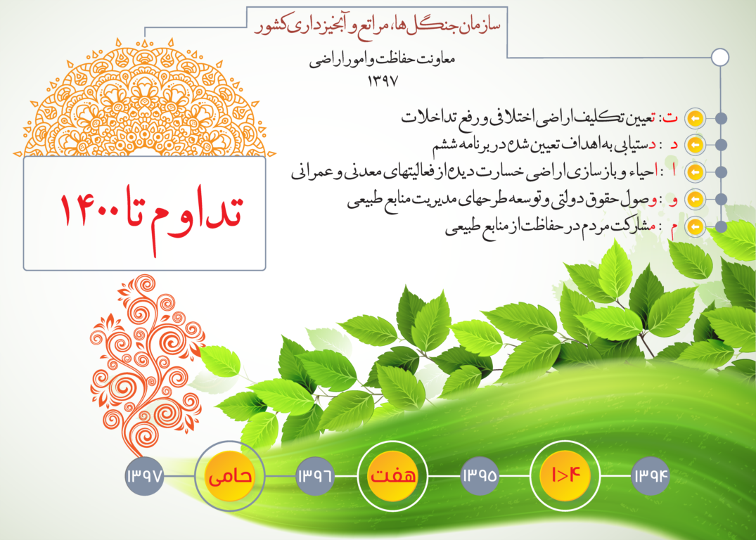 پایگاه اطلاع رسانی پیام طبیعت براساس گزارش معاونت حفاظت و امور اراضی در سال 1397 و در ادامه فعالیت های کاهش عوامل تخریب، طرحی جدید با عنوان «تداوم تا 1400» را عملیاتی نموده و 5 فعالیت عمده از جمله تعیین تکلیف اراضی اختلافی و رفع تداخلات، دستیابی به اهداف تعیین شده در برنامه ششم، احیاء و بازسازی اراضی خسارت دیده از فعالیت های معدنی و عمرانی، وصول حقوق دولتی و توسعه طرح های مدیریت منابع طبیعی و بالاخره مشارکت مردم در حفاظت از منابع طبیعی در دستور کارخود قرار داده است.