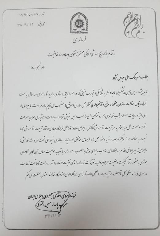 متن حکم انتصاب سردار عباس نژاد به شرح ذیل است: