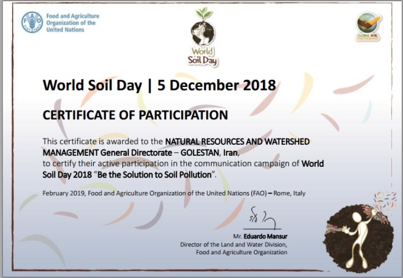 سازمان ملل متحد با اعطای گواهینامه به اداره کل منابع طبیعی و آبخیزداری استان گلستان از برگزاری فعال هم اندیشی روز جهانی خاک توسط این اداره کل قدردانی کرد.