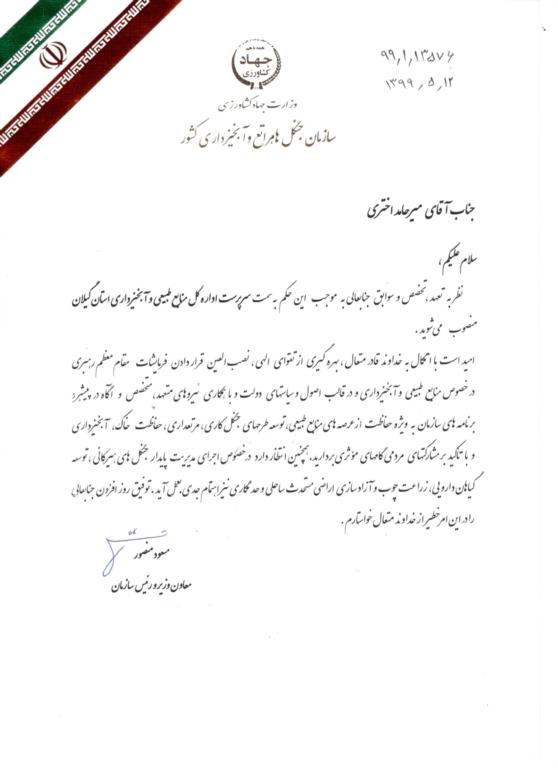 به گزارش پایگاه اطلاعرسانی سازمان جنگلها، مراتع و آبخیزداری کشور، دکتر مسعود منصور معاون وزیر جهاد کشاورزی و رئیس سازمان جنگلها، مراتع و آبخیزداری کشور طی حکمی مهندس میرحامد اختری را به عنوان سرپرست اداره کل منابعطبیعی و آبخیزداری استان گیلان منصوب نمود.
