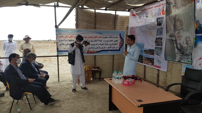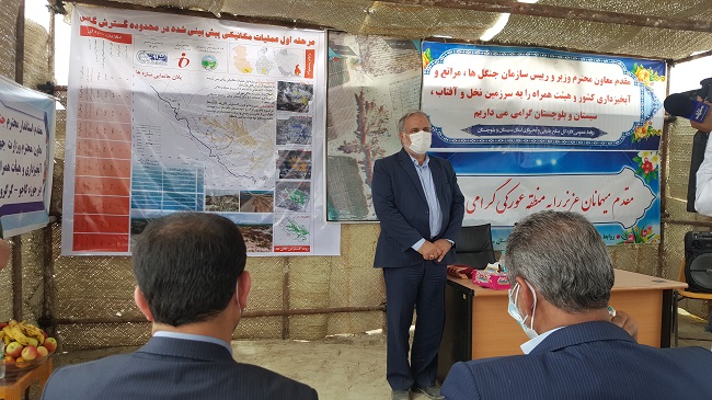 معاون وزیر جهاد کشاورزی و رئیس سازمان جنگل ها و مراتع و آبخیزداری کشور در این مراسم با بیان اینکه امسال برای جلوگیری از فرسایش خندقی و گسترش گالیها در منطقه بیش از 100 میلیارد تومان اعتبار اختصاص داده شده است گفت: سیل سال 98 خسارت جدی به این منطقه وارد کرده و آسیب های زیادی به زیرساخت ها و منابع رسانده است، مردم در واقعهی سیل تنها بخشی از خسارت را مثل خسارت به منازل و مال و اموال میبینند که در جای خود مهم است، اما بخشی از این خسارت که مغفول مانده ناشی از خسارتی است که به منابع پایه به ویژه خاک وارد میشود، با برآوردی که انجام شده است بیش از 400 میلیارد تومان ارزش خاکی بود که در منطقه دشتیاری شهرستان چابهار بر اثر سیل اخیر از دست رفت.