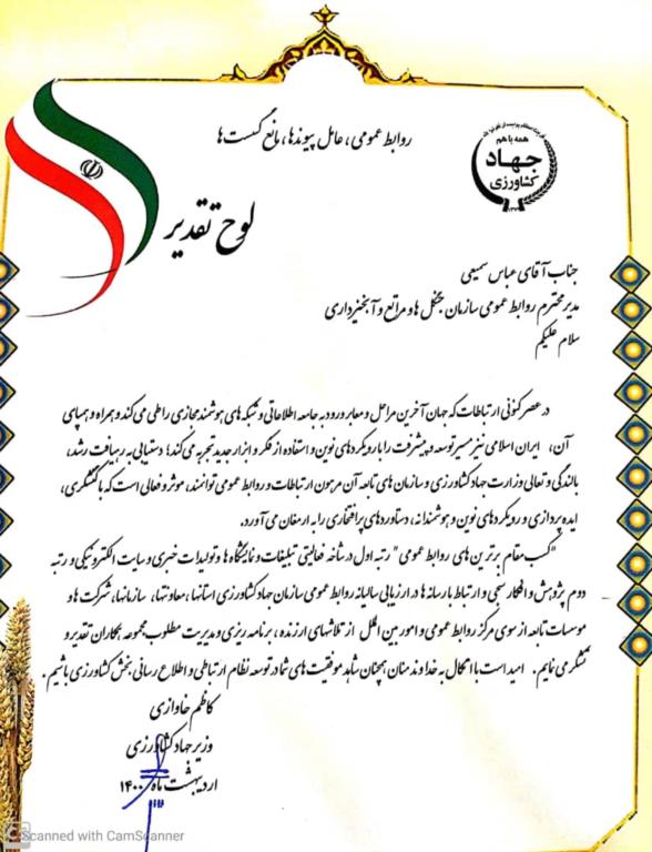 The Public Relations and International Affairs Bureau (PRBIA) of FRWO was awarded in the annual evaluation of the Ministry of Agriculture Jahad.
