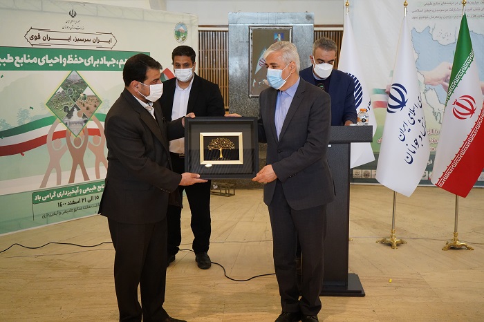 مسعود منصور در این آیین تندیس بلوط، نماد سازمان منابع طبیعی کشور را به دکتر سجادی وزیر ورزش اهداء کرد.