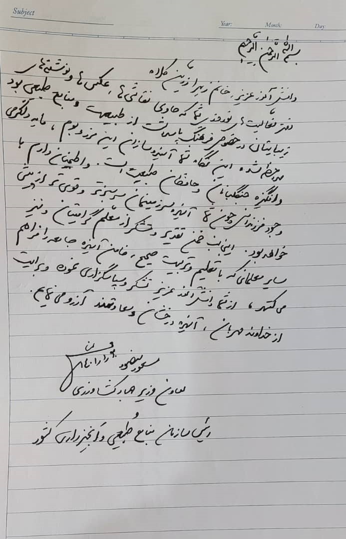 به گزارش پایگاه اطلاعرسانی سازمان منابعطبیعی و آبخیزداری کشور، دکتر مسعود منصور برای این دختر خردسال متن تقدیری نوشت و از او و معلم گرانقدرش تشکر نمود. متن نامه بدین شرح است:
