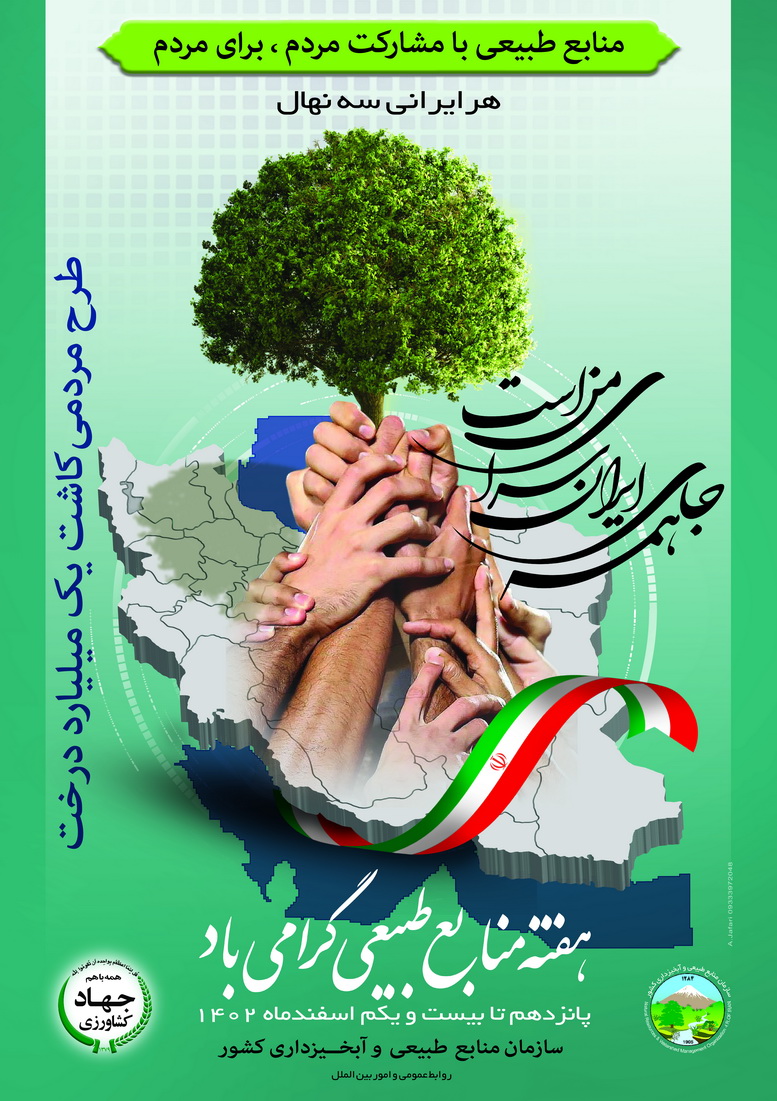 وی با اعلام " منابع طبیعی، با مشارکت مردم، برای مردم" به عنوان شعار محوری هفته منابع طبیعی و آبخیزداری امسال افزود: هفته منابعطبیعی و آبخیزداری سال 1402 همچون سالهای گذشته، گسترش فرهنگ حفظ، احیاء، توسعه و بهرهبرداری اصولی و پایدار از منابعطبیعی تجدیدشونده کشور و معرفی اقدامات سازمان منابعطبیعی و آبخیزداری را مورد توجه قرار خواهد داد و لیکن یکی از ویژگیهای مهم آن در سال جاری، تداوم پویش مردمی "ایران سرسبز- ایران قوی" و برنامه ریزی در راستای"طرح مردمی کاشت یک میلیارد درخت" است که به دستور ریاست محترم جمهوری، تأکید وزیر محترم جهاد کشاورزی مبنی بر استفاده از حداکثر توان کشور برای افزایش فضای سبز و درختکاری، در بازه زمانی چهار ساله (1405-1402) و تدابیر ریاست محترم سازمان منابع طبیعی و آبخیزداری کشور اجرایی خواهد شد.