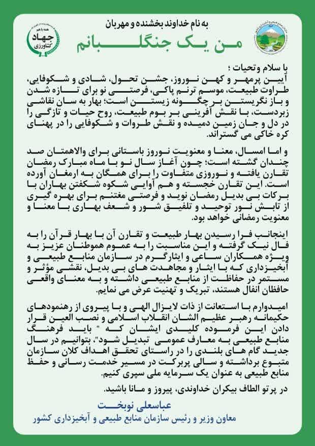 به گزارش مركز اطلاع رساني سازمان منابع طبیعی و آبخیزداری کشور، دكتر عباسعلی نوبخت در آستانه سال نو، پيام نوروزي صادر نمود.
