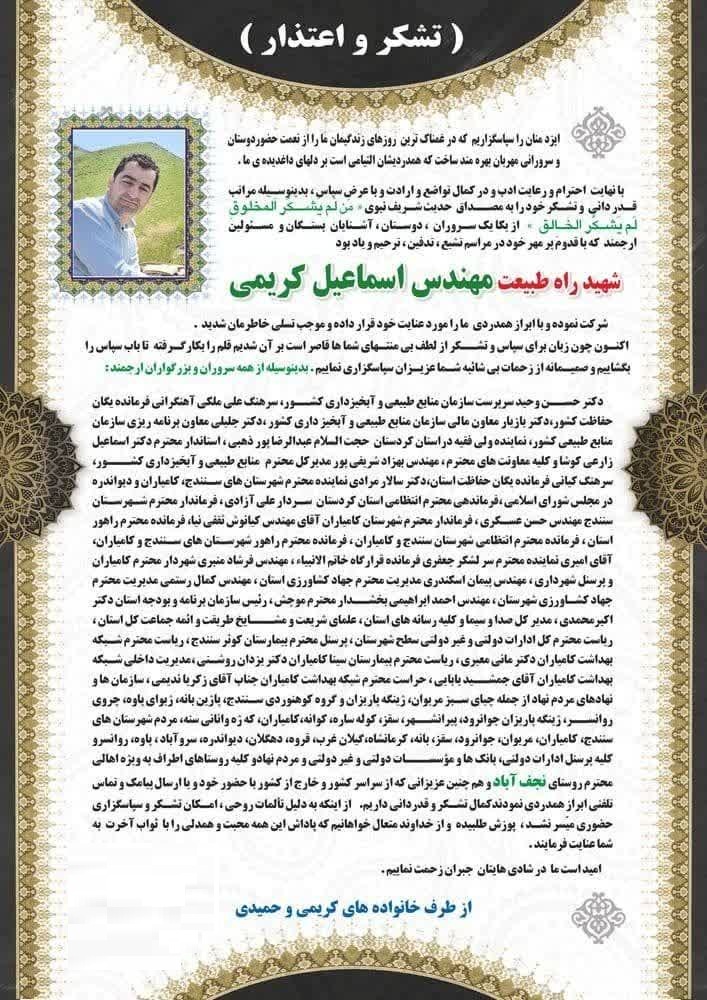 به گزارش پایگاه اطلاع رسانی سازمان منابع طبیعی و آبخیزداری کشور، خانواده زنده یاد اسماعیل کریمی در اطلاعیه تشکر و اعتذار خود با اشاره به حدیث شریف نبوی "من لم یشکرالمخلوق لم یشکر الخالق" از یکایک شخصیت های حقیقی و حقوقی کشوری و استانی بویژه دکتر حسن وحید؛ سرپرست سازمان منابع طبیعی، معاونین و مدیران و فرمانده یگاه حفاظت سازمان منابع طبیعی به جهت شرکت در مراسمات تشییع، تدفین و یادبود و نیز ابراز همدردی و عرض تسلیت آنها قدردانی و تشکر کرد.