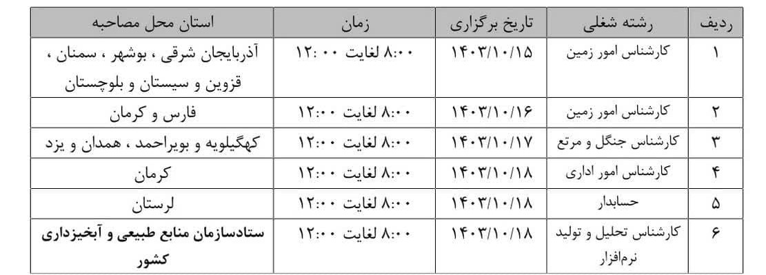 استان هایی که در اولین آزمون اختصاصی استخدام معلولین دارای سهمیه بوده اند شامل ستاد سازمان منابع طبیعی و آبخیزداری کشور و استان های لرستان، فارس، همدان، کرمان، آذربایجان شرقی، بوشهر، سمنان، سیستان و بلوچستان، قزوین، یزد و کهگیلویه و بویراحمد هستند که معرفی شدگان مرحله اول می بایست از تاریخ 1403/10/15 لغایت 1403/10/18 جهت مصاحبه شغلی شخصا به محل های پذیرفته خدمت مراجعه نمایند.